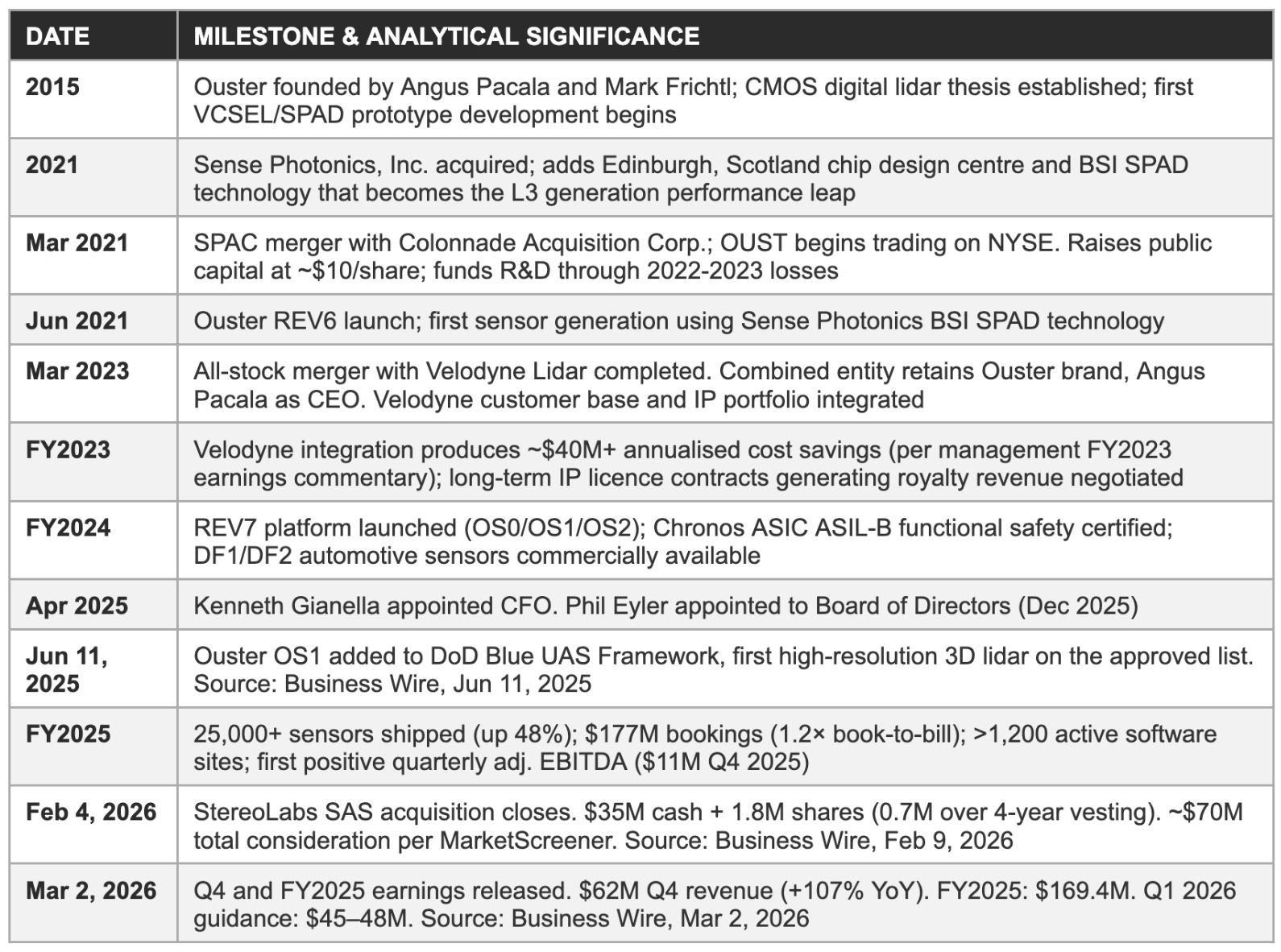 This analysis is based exclusively on publicly available information. Primary sources: Ouster, Inc. Q4 and full-year 2025 earnings release and press release (March 2, 2026, Business Wire); Q4 2025 earnings call transcript (March 2, 2026, accessed via Yahoo Finance, Motley Fool, and Moby); StereoLabs acquisition announcement and 8-K filing (February 9, 2026, Business Wire); Blue UAS Framework approval press release (June 11, 2025, Business Wire); TechCrunch interview with CEO Angus Pacala (February 9, 2026); Morningstar stock data (March 4, 2026); Investing.com analyst consensus (March 3, 2026); MarketScreener acquisition database (February 2026); Benzinga, Yahoo Finance, and StockTitan financial data; Advexure NDAA/Blue UAS compliance analysis; and publicly available SEC filings and prior-period earnings releases. All data cited is sourced from these public materials unless explicitly identified as our own estimate.