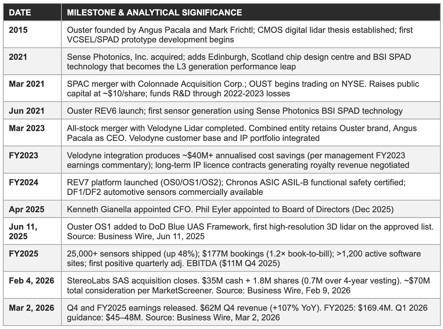 Ouster has executed three acquisitions and a SPAC listing in the four years since going public, each materially reshaping its cost structure, competitive position, and capital requirements. The Velodyne merger, widely expected to destroy value through integration friction, instead delivered IP royalties, customer consolidation, and cost savings that substantially exceeded pre-merger analyst expectations. The StereoLabs acquisition, completed February 4, 2026, is the most consequential transaction yet: it represents a strategic pivot from lidar-only hardware to a multimodal sensing and perception platform that management calls Physical AI.