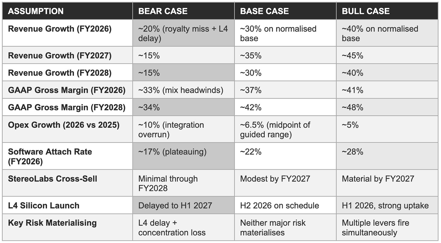 At roughly $22 per share, the market is pricing in base-to-bull case execution through FY2027-2028. That is not irrational given the track record, but it means there is limited margin for error in the near term. Investors buying today are not paying for a cheap, overlooked company. They are paying for a well-positioned one and betting that the L4 delivers, StereoLabs integrates cleanly, and the royalty normalisation is understood rather than misread.