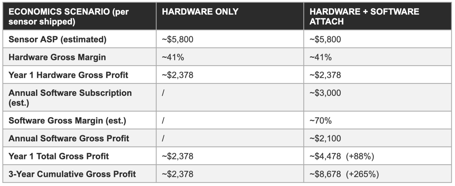 The attach rate progression, effectively 0% in 2022, approximately 5% in 2023, and exceeding 15% in FY2025, is the financial metric most directly linked to long-term gross margin re-rating. Each 1-percentage-point gain in attach rate on a 25,000-unit annual shipment base adds approximately 250 software-attached sensors. At an estimated $3,000 annual software subscription with 70% gross margin, that generates approximately $525,000 in additional recurring annual gross profit, compounding with each renewal year. Reaching a 30% attach rate on a hypothetical 40,000-unit FY2027 shipment base would add over $15 million in annual recurring gross profit relative to 2025 levels, without a single additional hardware sale.
