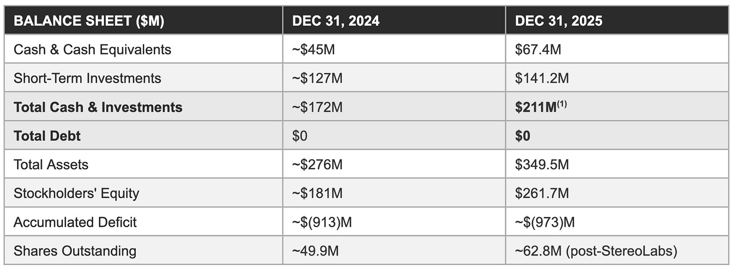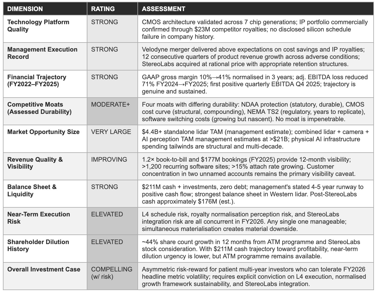 The third pillar is M&A execution track record. The Velodyne merger was widely expected to destroy value; instead it generated IP royalties, absorbed a competitor, and consolidated an installed base. StereoLabs was acquired at 4.4× revenue for an EBITDA-positive target with 90,000 deployed cameras and an active developer community, a capital-efficient way to add the camera modality, developer ecosystem, and AI perception software stack that the Physical AI platform thesis requires. Neither transaction required emergency equity issuance at distressed prices. Both were funded from a position of balance sheet strength.