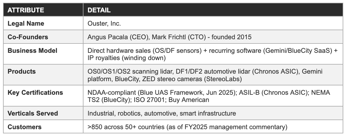 Ouster is a provider of high-performance digital lidar sensors, perception software, and AI stereo vision cameras. The company serves four commercial verticals: industrial automation, robotics, automotive ADAS, and smart infrastructure. It is the surviving entity of the March 2023 all-stock merger with Velodyne Lidar, Inc. and the 2021 acquisition of Sense Photonics, Inc. Its co-founders, CEO Angus Pacala and CTO Mark Frichtl, have led the company continuously since its 2015 founding, an unusual tenure for a pre-profitability deep-technology hardware company operating in a sector that has claimed Luminar Technologies (Chapter 11, late 2025), AEye, and numerous other Western lidar companies.