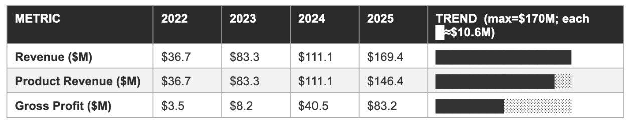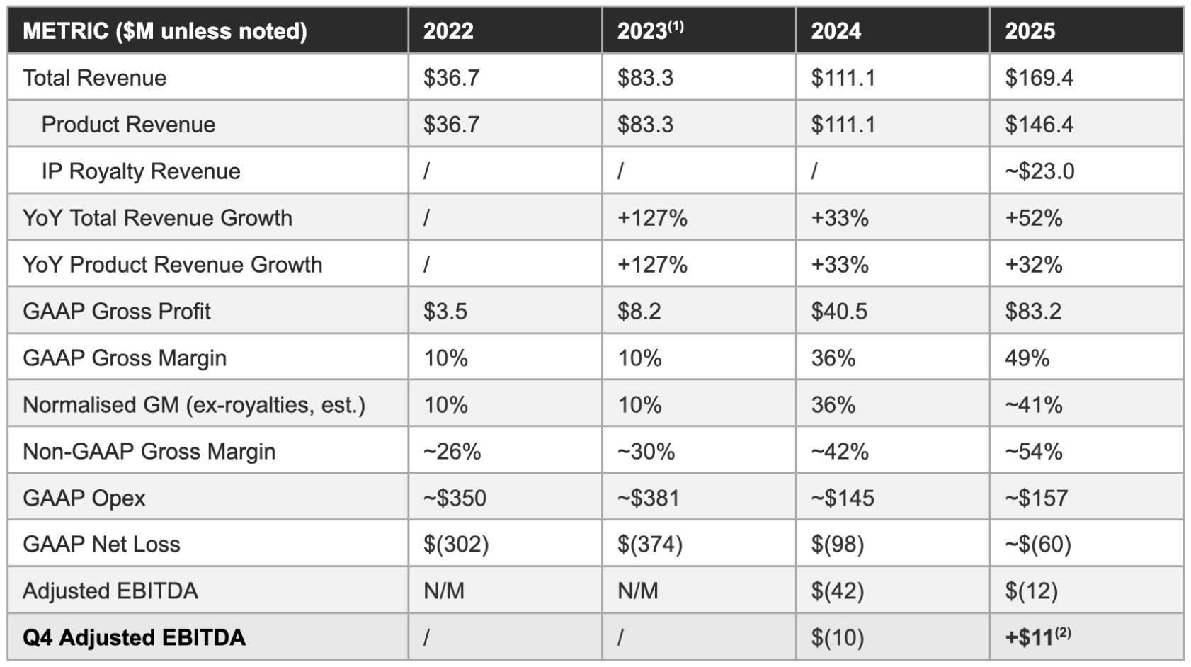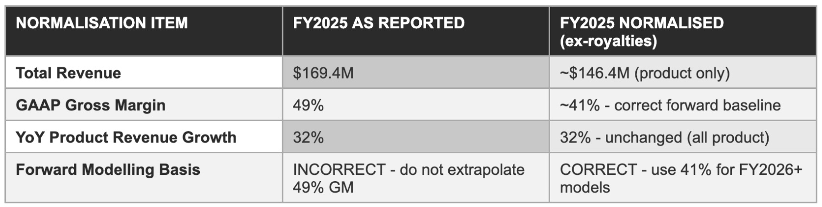 2025’s $169.4 million in revenue and 49% gross margin are materially influenced by approximately $23 million in primarily one-time IP royalties, a contribution that lifted both the revenue growth rate and the margin profile above the underlying operational trajectory. Any investor modelling FY2026 off reported 2025 metrics without adjusting for the royalty normalisation will misread the financial trajectory. The analytical imperative is to separate the structural improvement, which is substantial and genuine, from the one-time contribution.