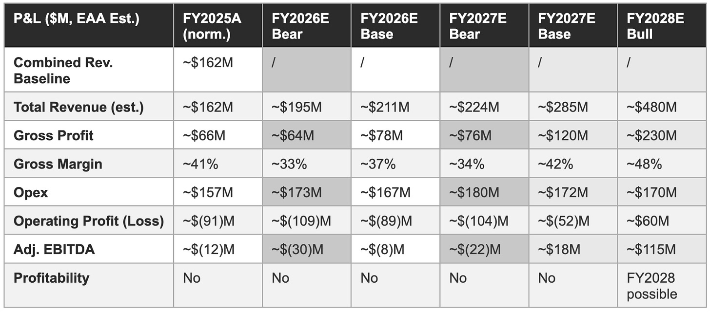 The three-scenario model below is built on management’s disclosed long-term financial framework, 30-50% annual revenue growth, 35-40% gross margins (excluding royalties), Opex growth 5–8% from 2025 levels, applied to the normalised 2025 product revenue baseline of approximately $146.4 million, plus a pro-forma StereoLabs contribution of approximately $16 million unaudited 2025 revenue (combined baseline of approximately $162 million). All estimates are our own projections and are not endorsed by, attributed to, or reviewed by Ouster management.