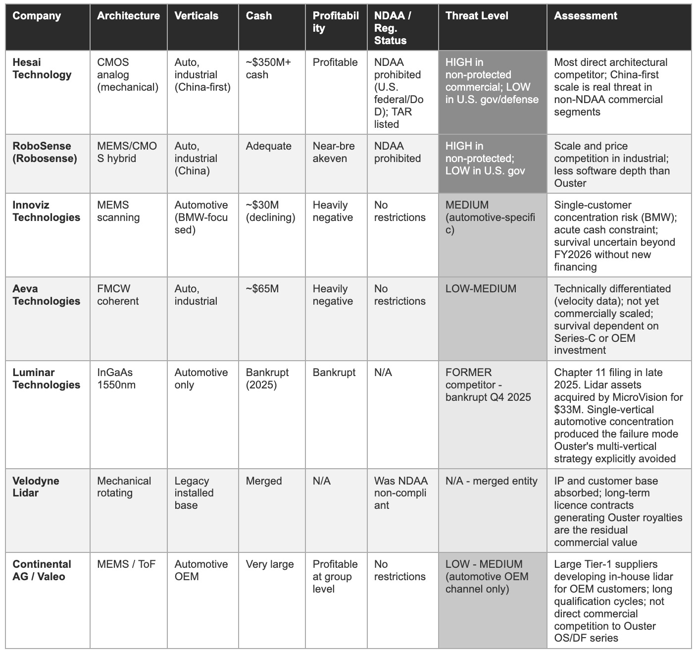The lidar competitive landscape in March 2026 is profoundly different from the one that existed at the time of Ouster’s SPAC listing in 2021. The Western lidar industry has undergone a period of consolidation that has eliminated or severely impaired most of the dozen or more publicly listed lidar companies that existed at peak market enthusiasm. The survivors are, with few exceptions, better positioned now than they were in 2021, fewer better-capitalised competitors, more rational pricing, and more clearly defined market segments. The threat, as always, comes from Chinese manufacturers whose scale advantages in the unprotected segments of the global market are real and growing.