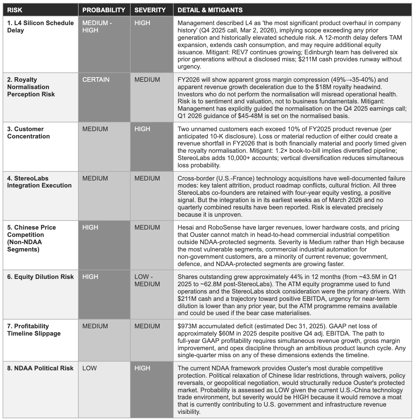 The practical consequence of this calculation: the current $1.25B market cap is pricing in the base-to-bull scenario continuity through approximately FY2028–2029. It is not pricing in a bear-case scenario. Investors purchasing at $20.00-$22.00 per share are implicitly accepting the execution risk embedded in the L4 silicon roadmap, the StereoLabs integration, and the royalty normalisation, and receiving, as compensation, the operating leverage embedded in the 30-50% growth framework if it delivers. Whether that is an attractive trade depends on investors’ individual conviction about Ouster’s execution capability and the competitive moat durability assessed in Sections 8 and 9.