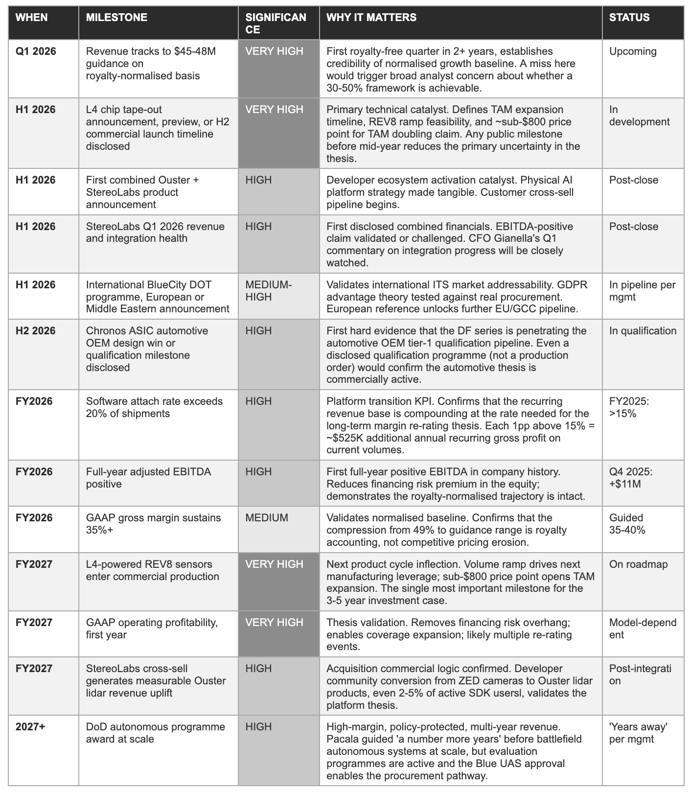 The non-biased summary is this: Ouster has earned the right to be taken seriously, and the next 12 months will determine whether it earns the right to be re-rated. The L4 milestone is the single data point that matters most. Everything else is noise until that one is resolved.